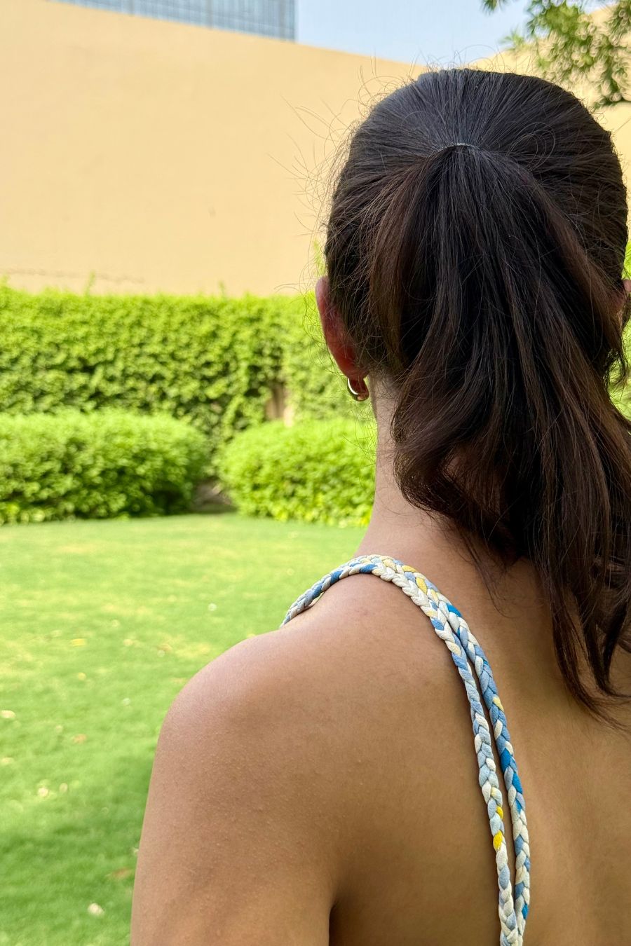 ● Braided shoulder straps for a subtle textural touch