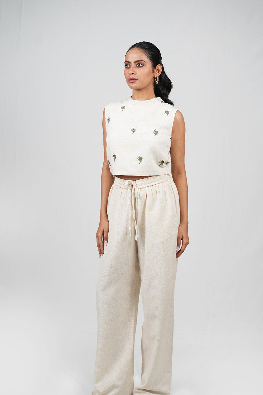 Comfortable, breezy, and finished with just the right amount of detail, this coord set is designed for days when you want to look put-together with zero fuss. Crafted in soft, flexible fabric that moves with you, the set features a cropped top with a mock neckline and keyhole back, paired with relaxed drawstring pants. The all-over palm embroidery adds a subtle, elevated touch that stays crisp and consistent over time. Whether worn together or styled separately, this set is all about ease, style, and versatility.
