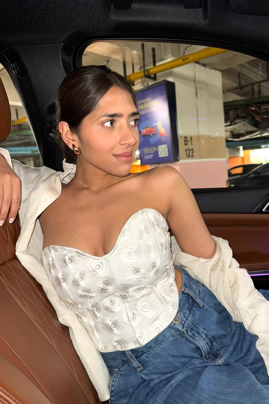 A structured cotton-linen corset with a sculpted sweetheart neckline that shapes and flatters. The front is covered in sunburst floral embroidery, adding just the right amount of detail. Finished with a back zipper for a secure, easy fit. Strong, feminine, and made to stand out.