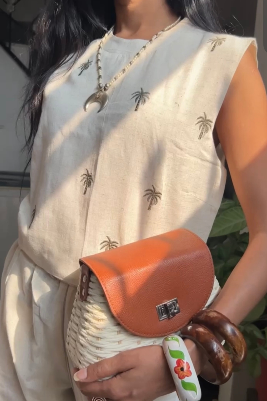 Easy, breezy, and perfectly detailed, this co-ord set is made from flex fabric that moves with you, keeping things comfortable and effortless. It features relaxed drawstring pants and a cropped top with a mock neckline and a keyhole back for a subtle touch of flair. The all-over palm embroidery adds a laid-back, summery vibe. Wear the set together for a polished look or mix and match for versatile style—either way, it’s made for days when you want to look put together without trying too hard.