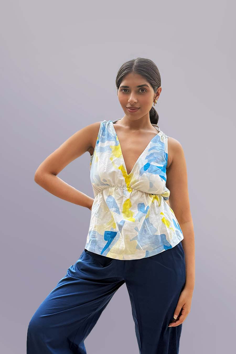 ● Deep V-neck top with wide shoulder straps and a gathered waist