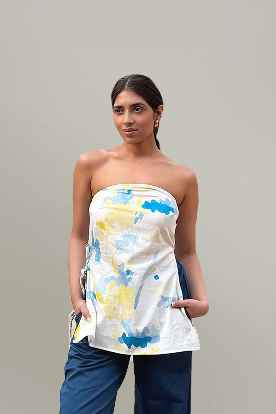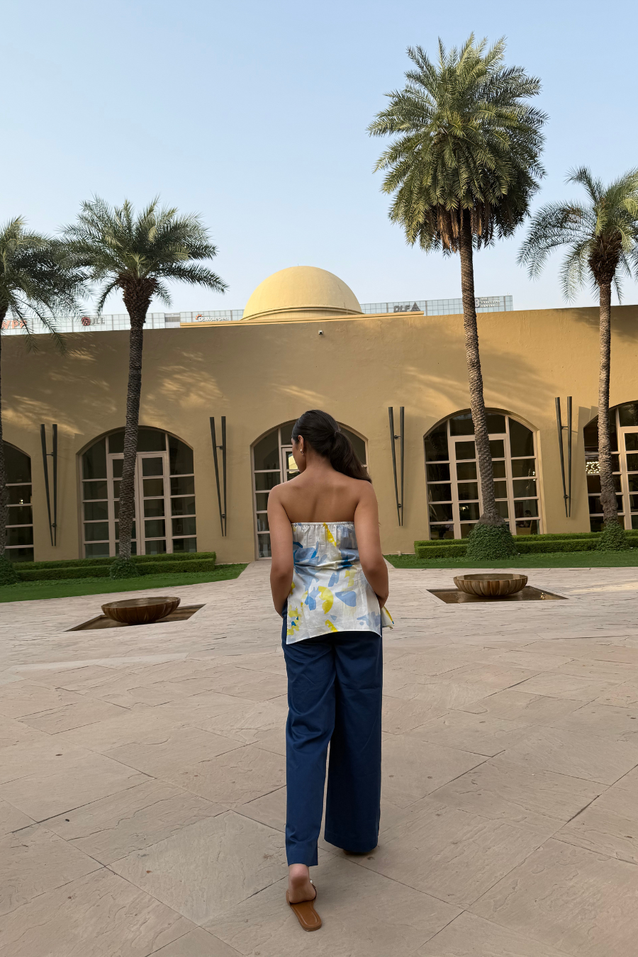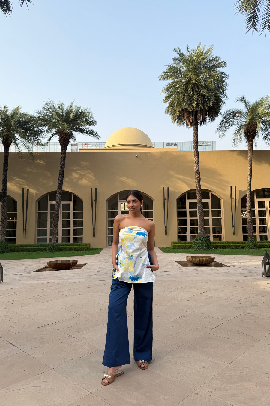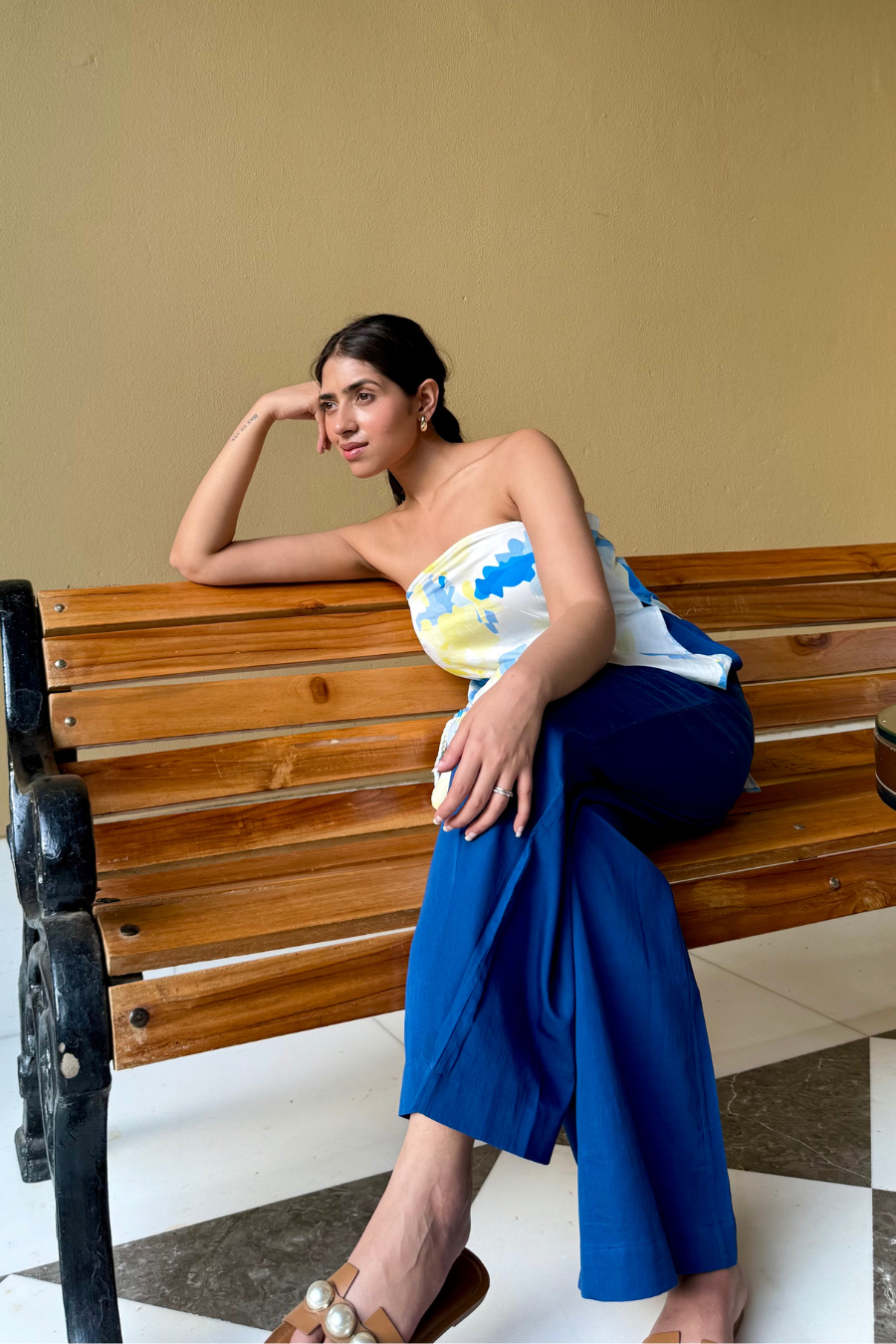 Bold meets breezy in this effortlessly stylish two-piece set. The strapless tube top features a striking watercolor print in blue, yellow, and white, finished with delicate braid detailing on one side for a subtle twist. It’s paired with high-waisted navy flared pants that offer movement and comfort, thanks to a relaxed fit and elasticated waistband. A set that’s equal parts structure and ease—perfect for when you want to stand out without trying too hard.